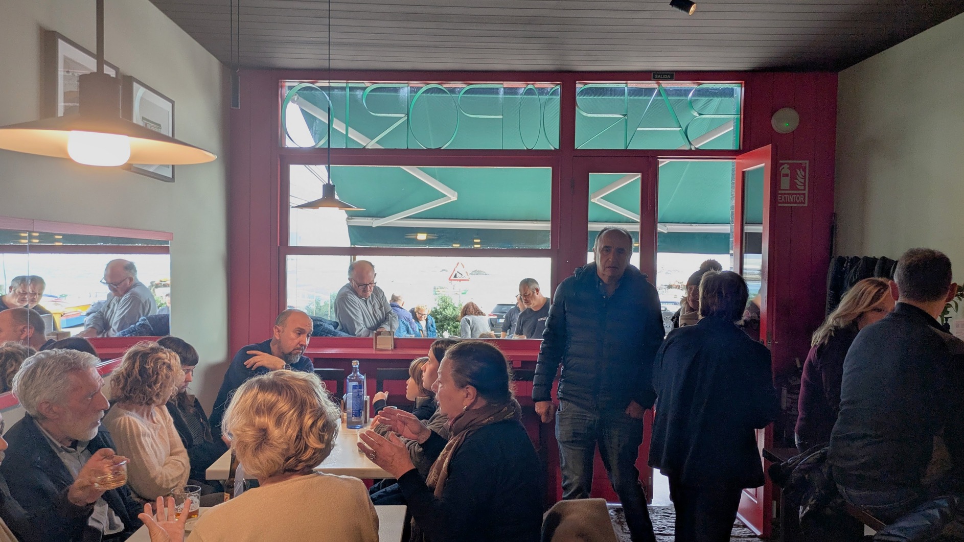 Chinchos ou xoubas, pode que empanada, para comezar. Mexillóns ao vapor, ou un peixe á prancha. Non pode faltar o chopo na súa tinta. E para rematar, un café e un merengue, co mar colándose pola fiestra e ese ambiente ecléctico, de clientes de diario mesturados con mitómanos chamados polo nome do gran arquitecto. Que sitio interesante é o Bar do Porto.