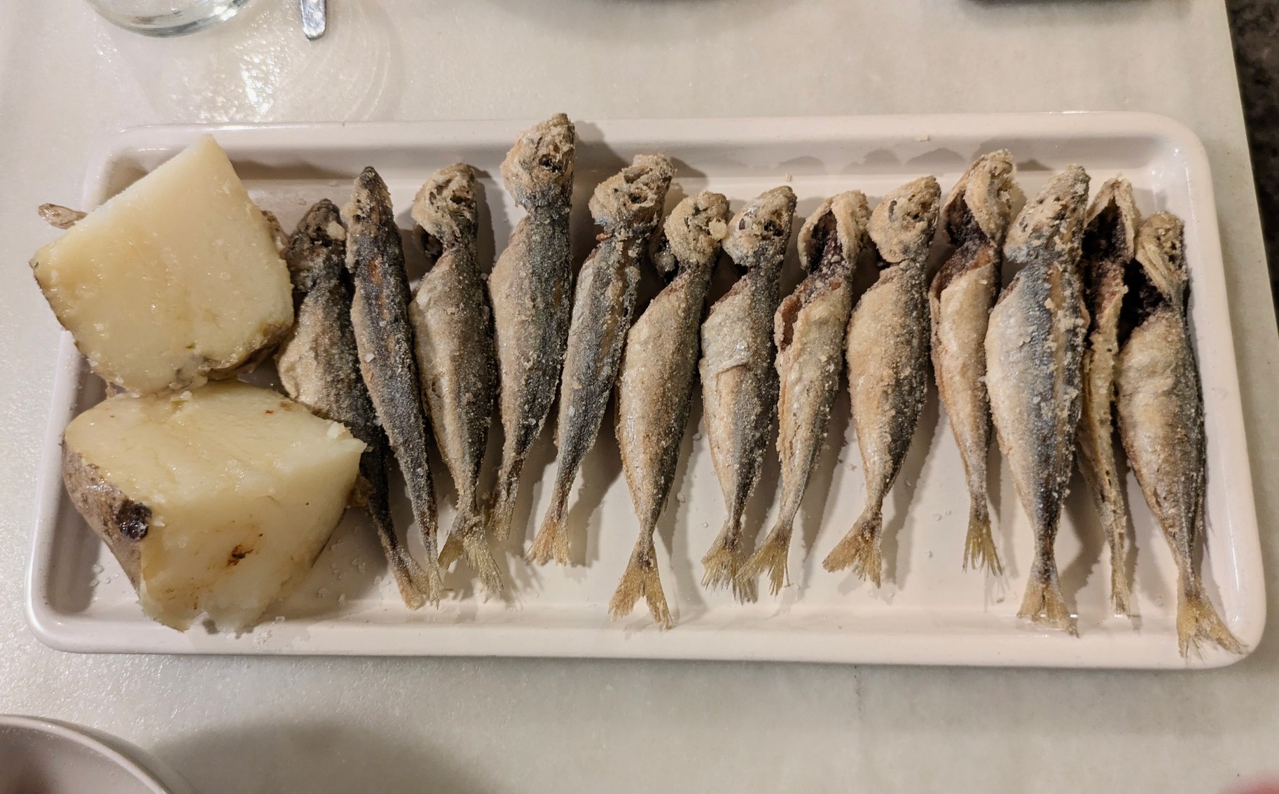 Se non a atopas aquí, a poucos metros, no peirao, tes O Taberneiro, que seguro que a ten. E terá tamén sardiñas, malo será. E peixe do día. E comelos aí, co mar batendo case que ás portas, ten un sabor especial.