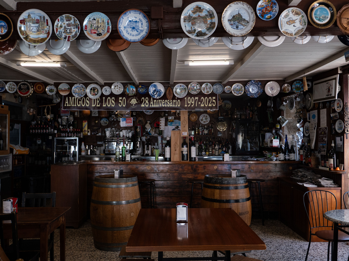 As paredes da taberna Mexillón están recubertas, literalmente, de pratos decorativos con recordos chegados de medio mundo
