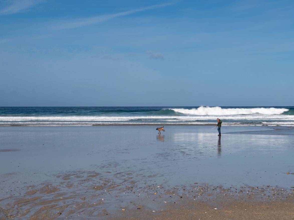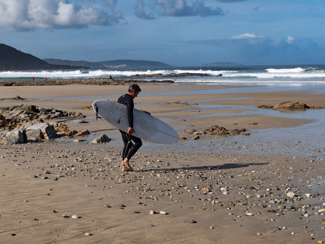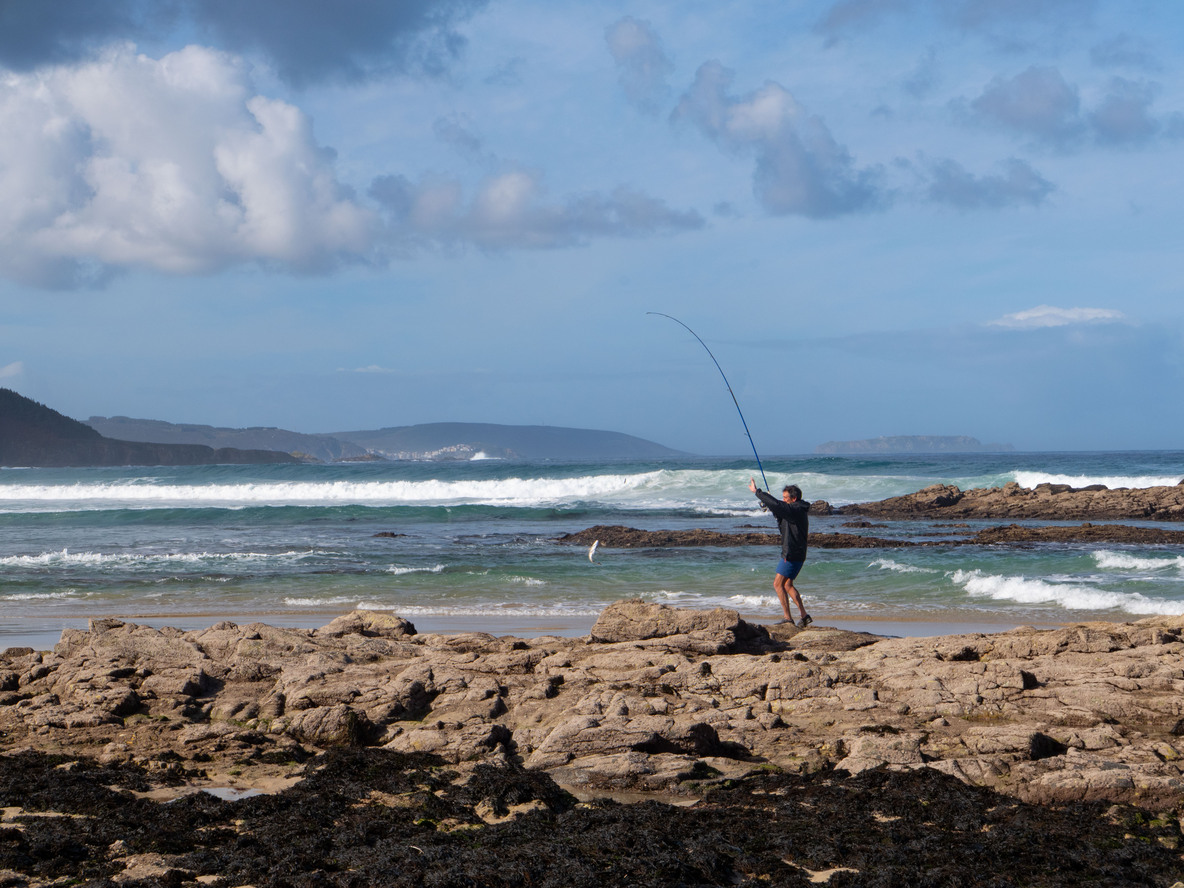 Pero non só de ondas e surf vai a cousa. Esta mañá hai xente paseando, soa ou coas súas mascotas, por este grande areal de máis de cinco quilómetros. Un can saltarico dedícase a perseguir dende a area, sen moito éxito, aos surfistas. Un pescador empoleirado a unhas rochas deleita a uns nenos coa súa última captura, quizais un sargo? clic. A praia de Razo está para pasar horas nela e non aburrirse, pero nós seguimos o noso camiño, co mar guiándonos, ata o seguinte porto: Caión.