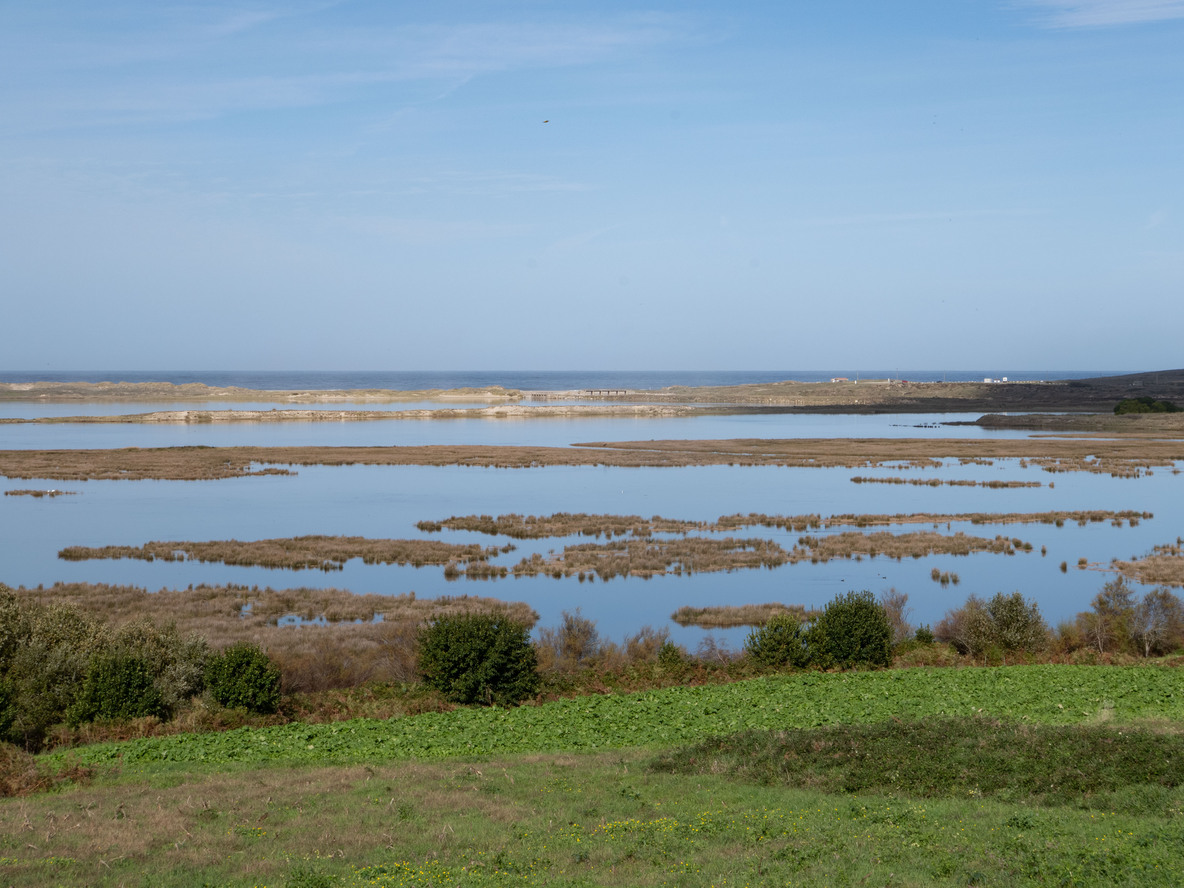 A praia de Razo está para pasar horas nela e non aburrirse, pero nós seguimos o noso camiño, co mar guiándonos, ata o seguinte porto: Caión. Antes, un alto para observar desde a distancia a lagoa de Baldaio