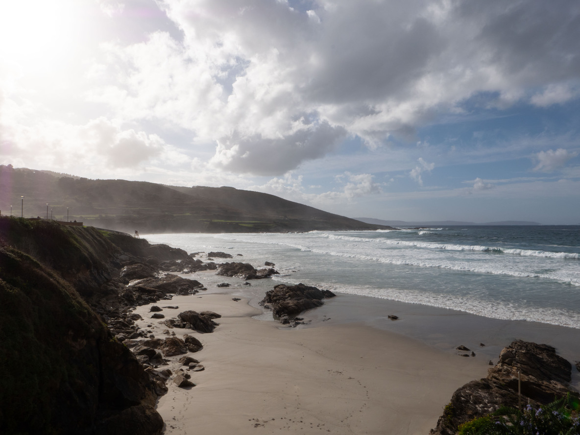 Agora si, poñémonos en marcha, pero aínda non cruzamos os límites municipais de Carballo. É imprescindible visitar a praia de Razo. Estamos no outono, pero esta é unha praia desestacionalizada. Recibe a maioría de visitantes a finais do verán, cando o vento e as temperaturas son máis propicias para a práctica do surf. Pero en pleno mes de novembro, tamén hai valentes que desafían as augas frías e se botan ao mar. As ondas hoxe, para unha persoa profana no tema coma min, están impresionantes. Un grupo de surfeiros deleitan aos visitantes coas súas manobras e custa separar a vista. clic.