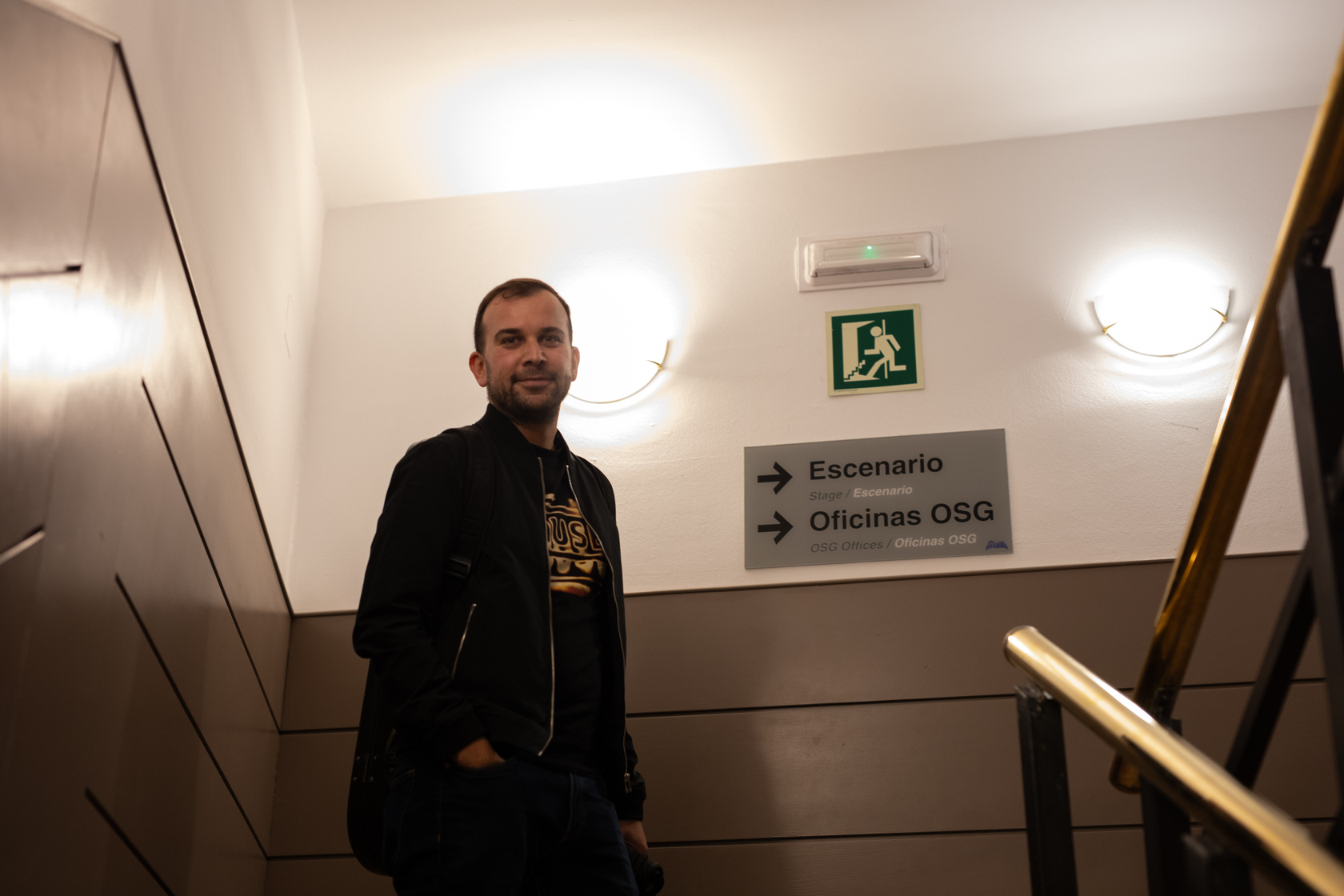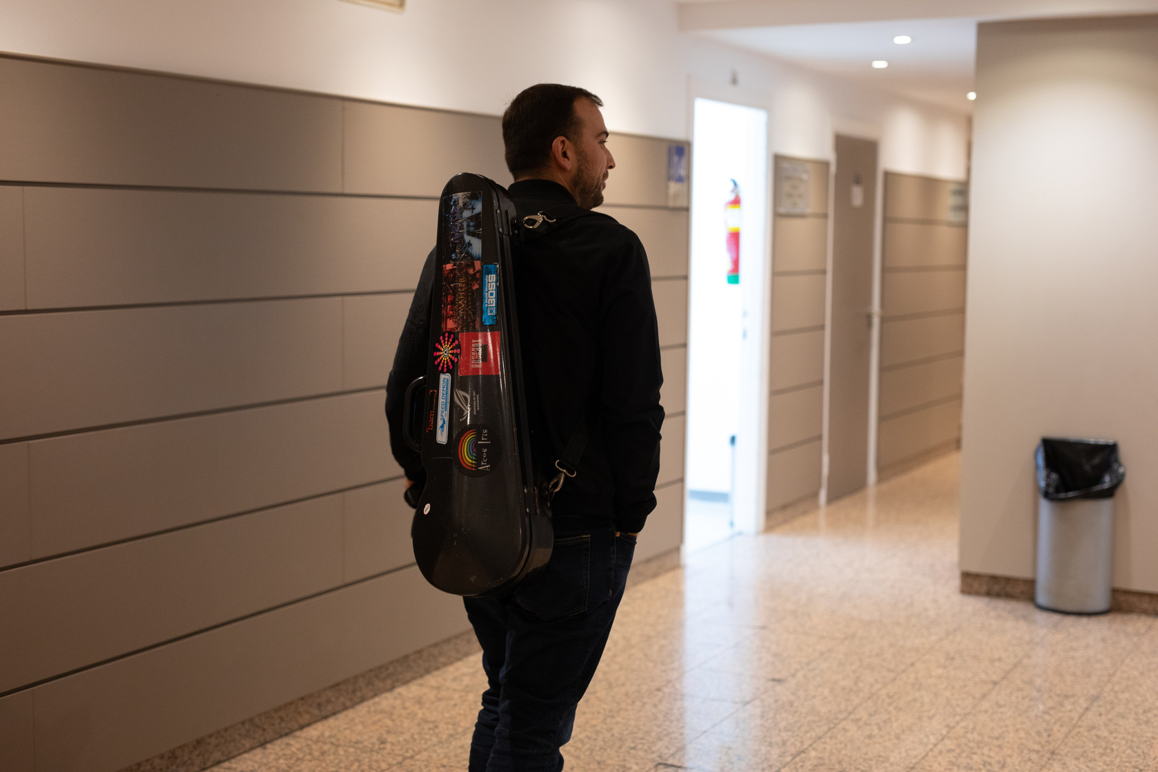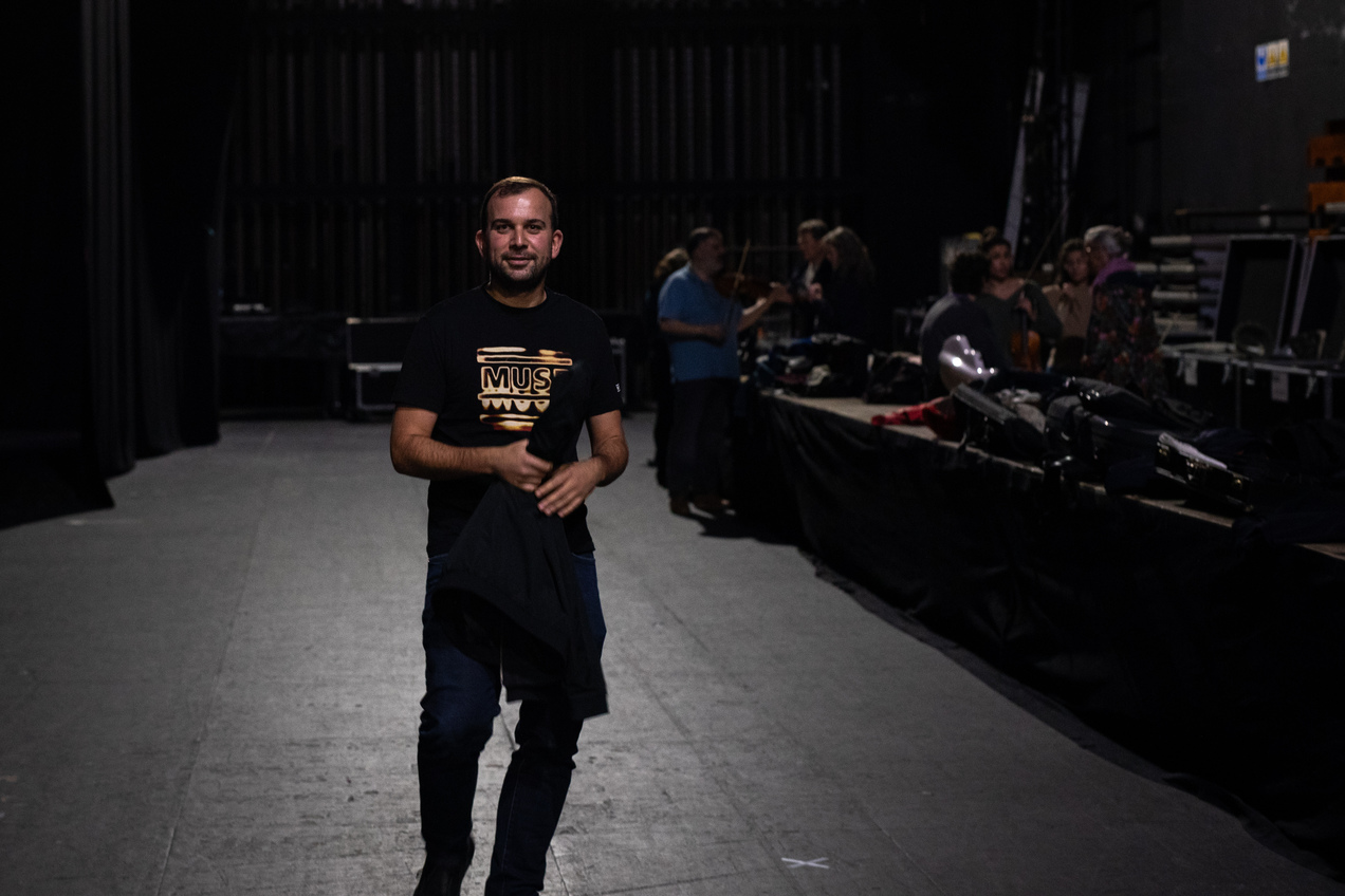 E así están as cousas. Penso que estou nun momento doce. Levo xa once anos na orquestra e teño uns compañeiros marabillosos. Tocar con eles é case como quedar cos colegas para presentar algo; non sinto nin nervios. Fíxate, estou máis tenso cando estou mesturando a outros músicos, cando fago de técnico de son. Esa é a outra cousa da que che dixen que che ia falar, outra vocación que posiblemente xurda dese momento de fascinación cunha peza de tecnoloxía musical, os auriculares do meu pai. Á parte de músico, son técnico de son e, como che dicía, aí si que me poño nervioso aínda. Se teño a un artista relevante, eses tres primeiros minutos, ata que os músicos saen e escoito un “Boas noites, Coruña”, e vexo que nada falla, son de taquicardia.