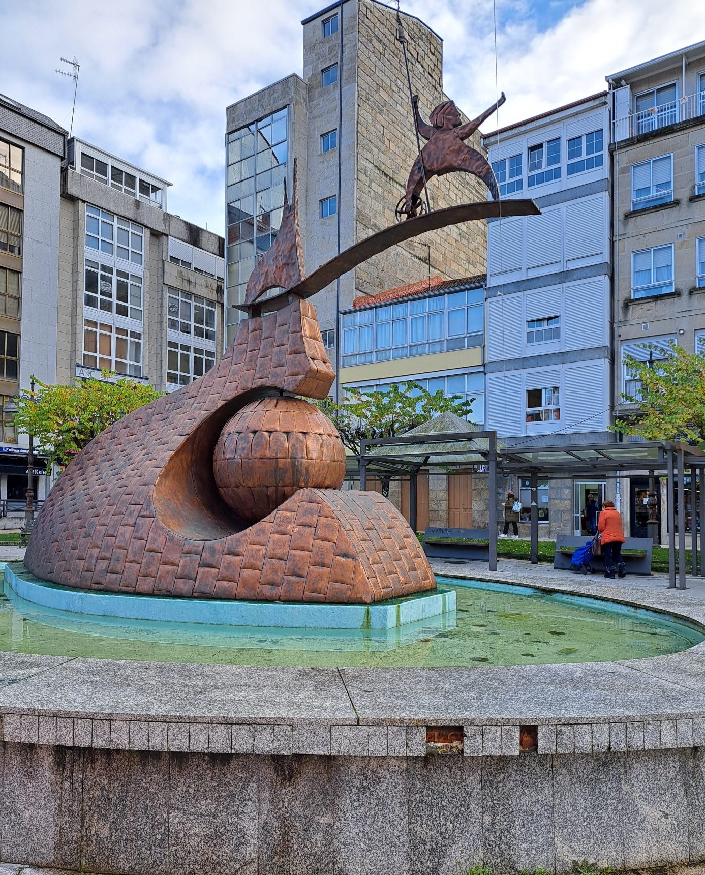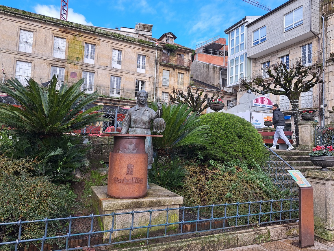 Escultura homenaxes ás pulpeiras, co edificio da familia Quiroga ao fondo. -