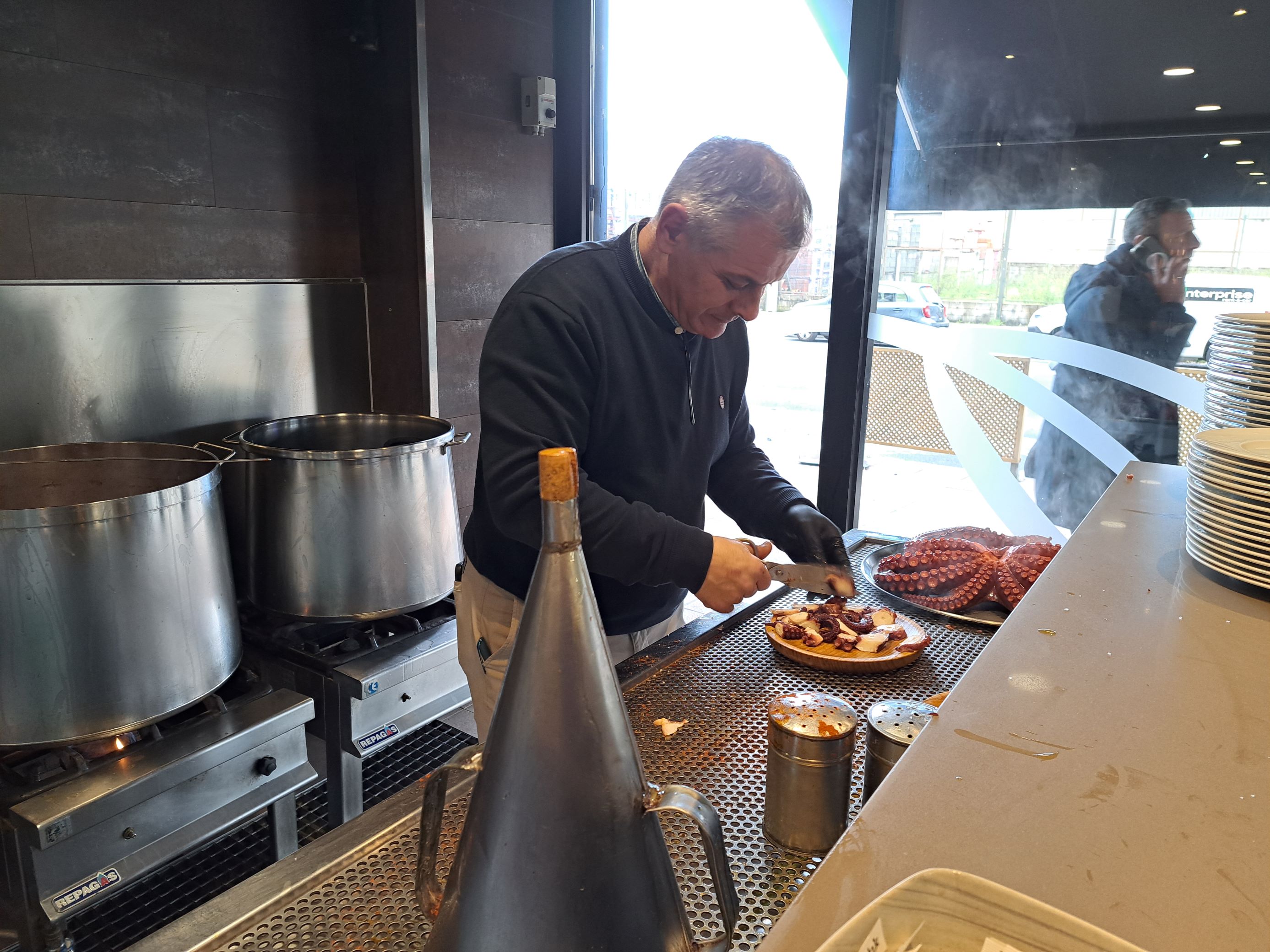 De Arcos precisamente é Antonio Pérez, a quen atopamos no Fuchela. Pérez é polbeiro en Cidade de México, onde leva xa 10 anos traballando no restaurante La Número 1. “O polbo triúnfa tamén por alí, claro que si, preparado á feira con aceite de aquí”, explica.